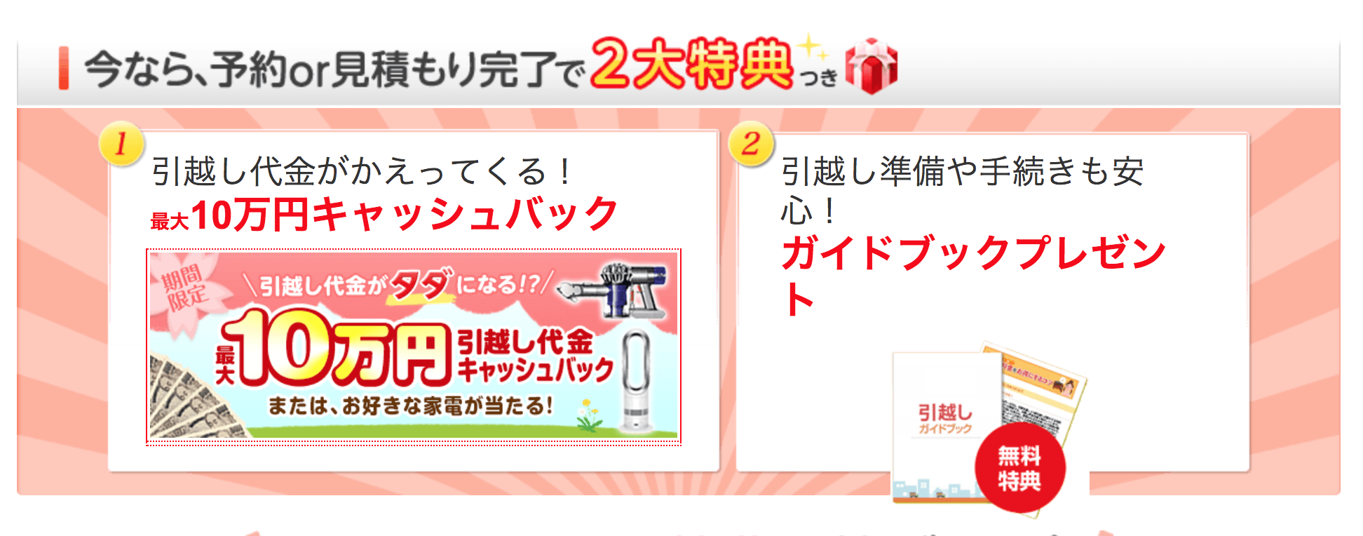 - 引越し代金がかえって来る、最大10万円のキャッシュバック付き