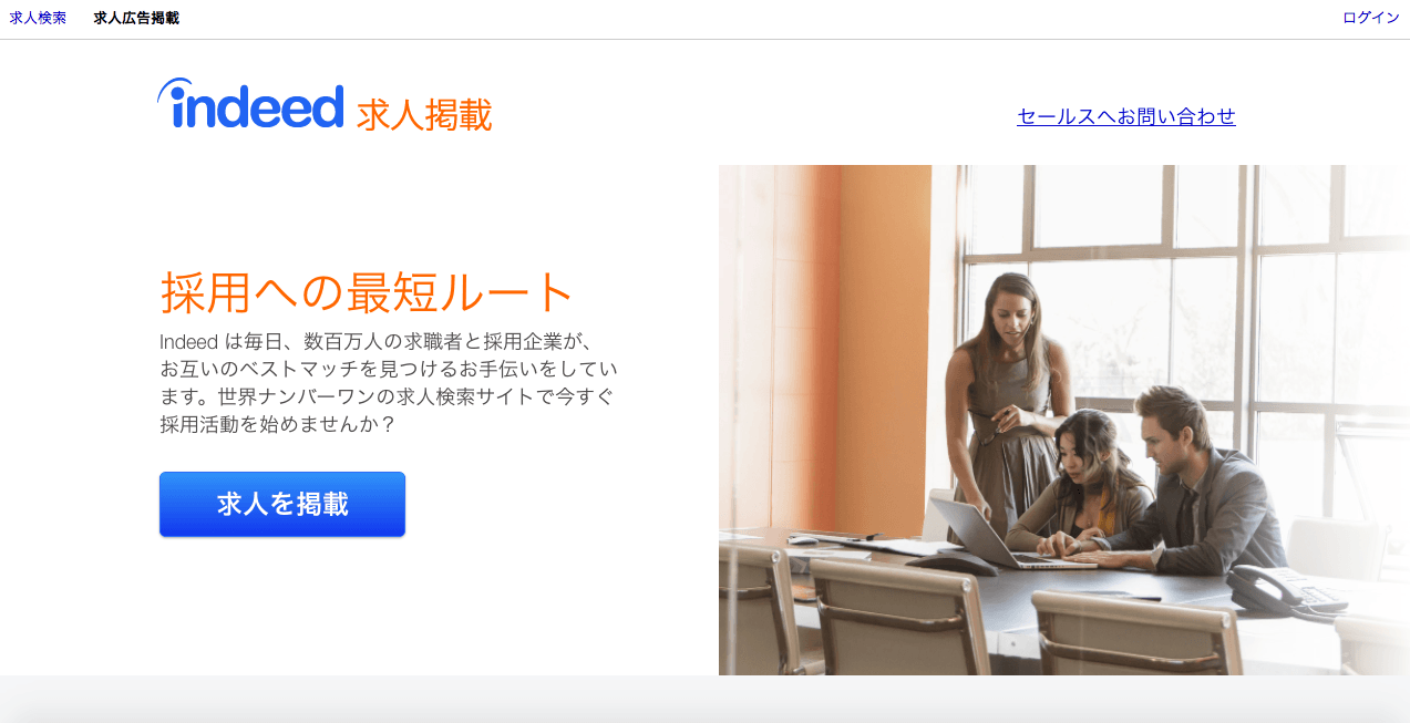 既にindeedを利用する会社は200万社を超えており、無料で求人広告を掲載開始できること、利用しやすいこと、エンジニアやデザイナーの 手を借りずに採用ページを作成できることが要因にあります。